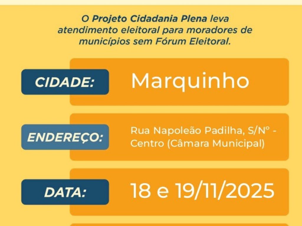 A Câmara Municipal de Marquinho convida toda a população para participar do Projeto Cidadania Plena, que será realizado em parceria com o Fórum Eleitoral.